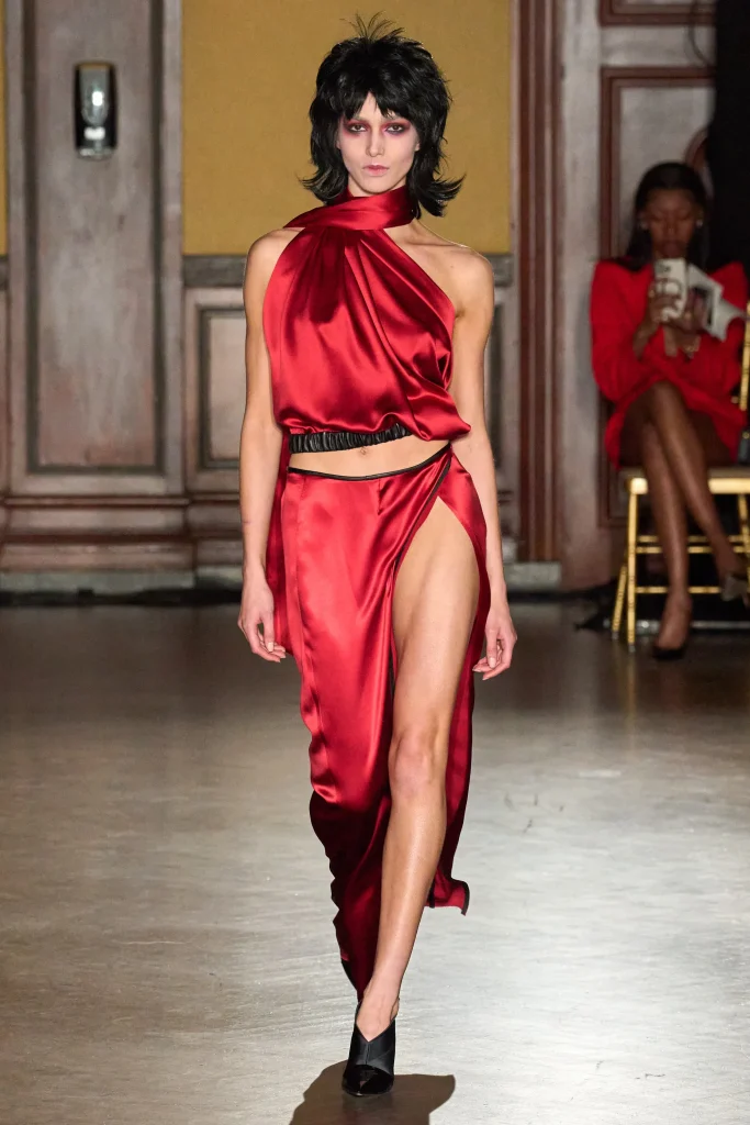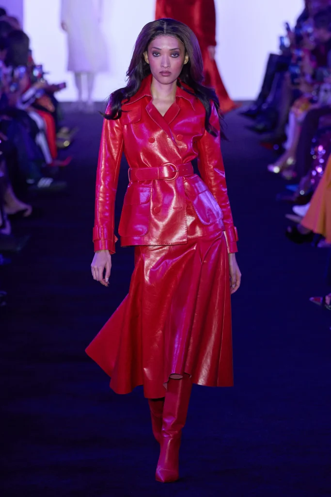 First up! Known for dressing stunning celebrities such as singers Beyonce, Rihanna, and Jennifer Lopez ; Sergio Hudson reigning from South Carolina presented (or debuted) his 2024 fall/winter collection with 46 dazzling looks; which as Tik Tokers would say gave “Rich bitch” vibes. Sergio’s inspo of the 1970s luxurious glam undoubtedly showed throughout this collection. Filled with double breasted coats, velvet two piece suits, and a golden high slit evening gown, not to mention the color palette consisting of deep reds, blues, and browns ; you can say Hudson achieved his feel for expensive looking luxury wear. “I really wanted to beef up the ready to wear, and make it more luxurious” Hudson says. Stunned by his collection this season, I can say the perfect consumer would be a “girl boss”not afraid of showing out in pieces that would make the room stop and stare.